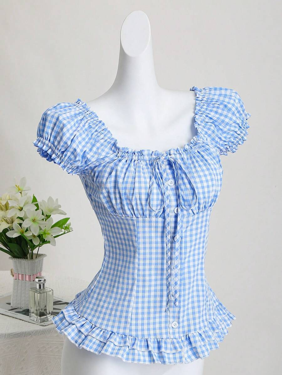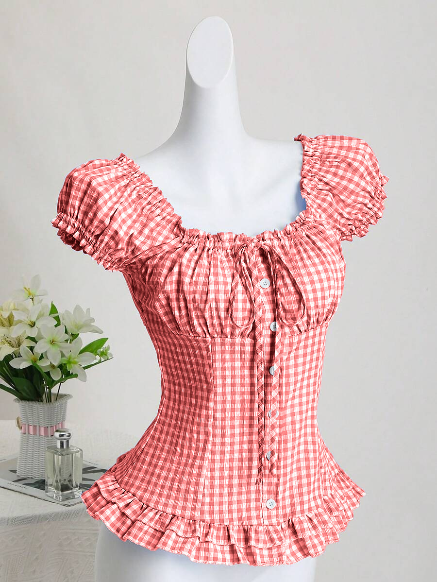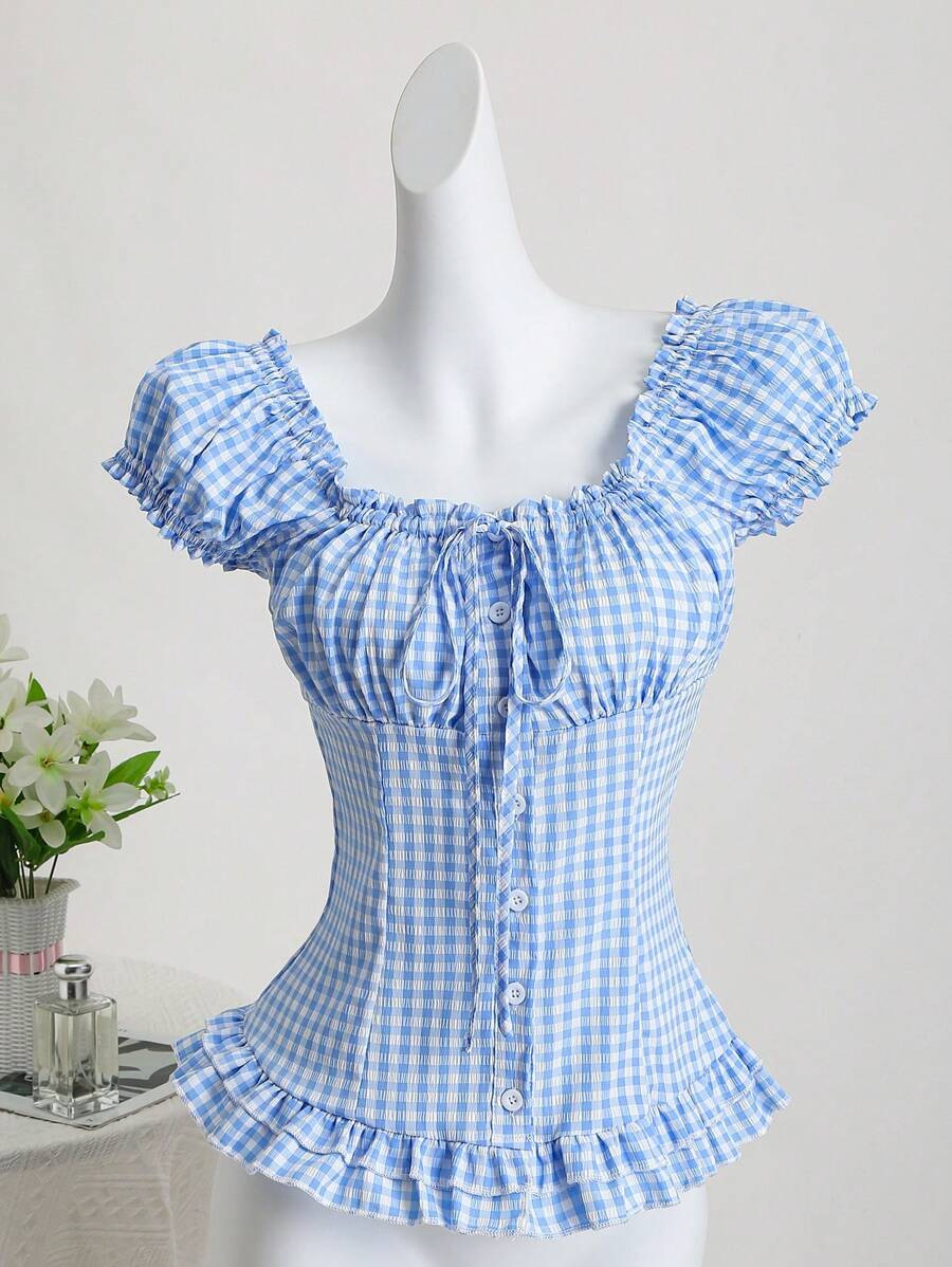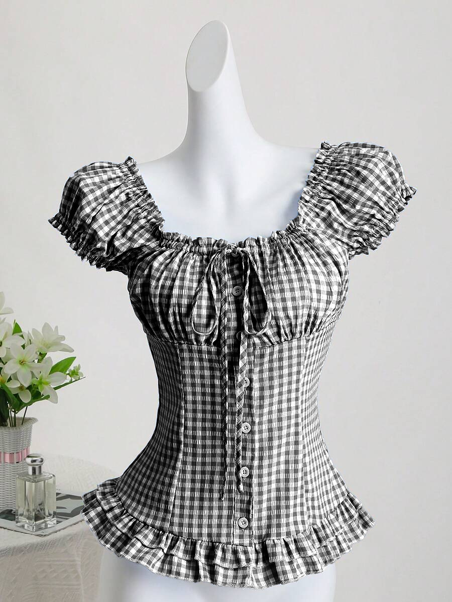 Features: Square neckline, puff sleeves, tie-front bow, slim fit, cropped length (40–50 cm), 3D pattern effect
