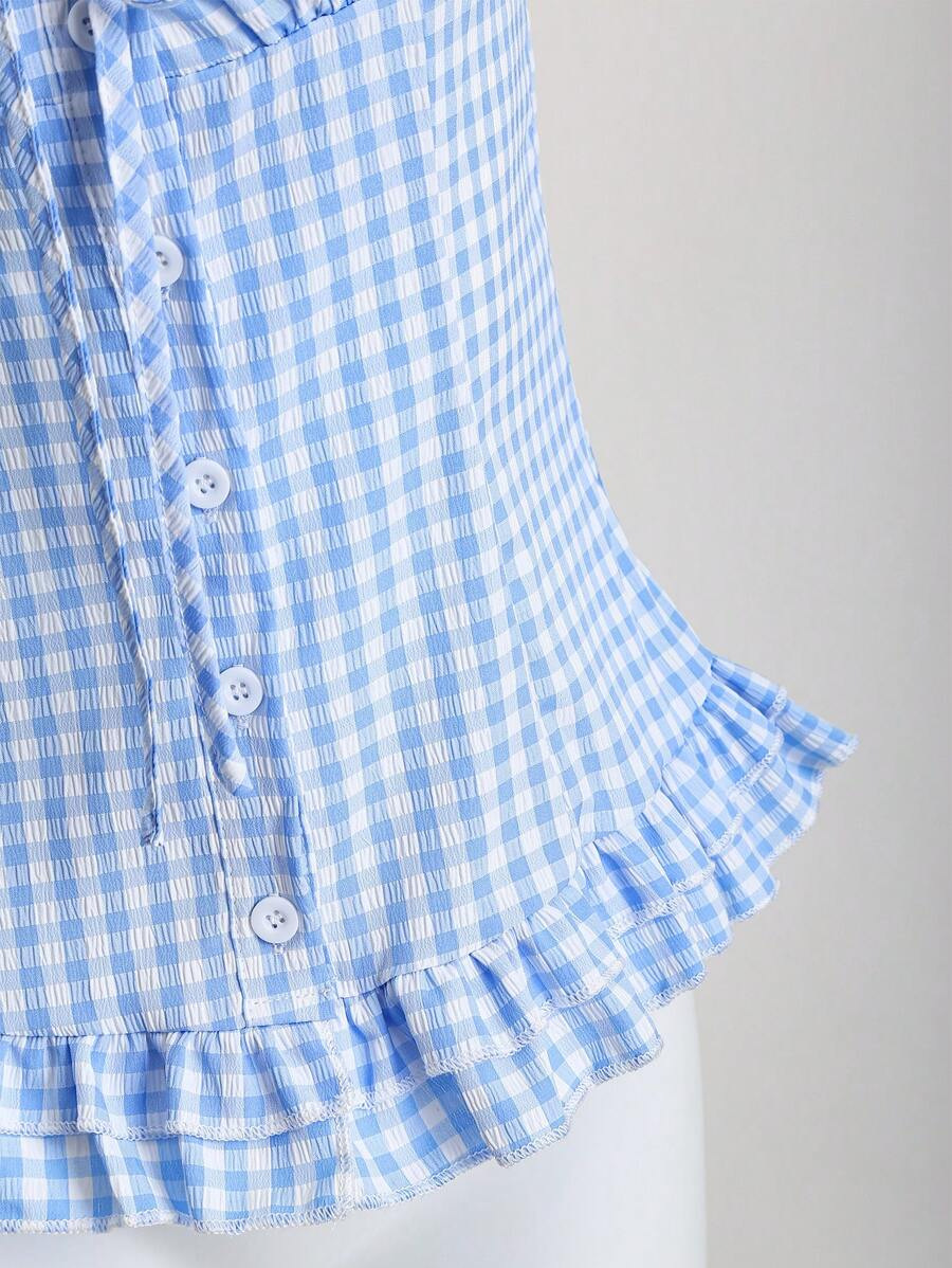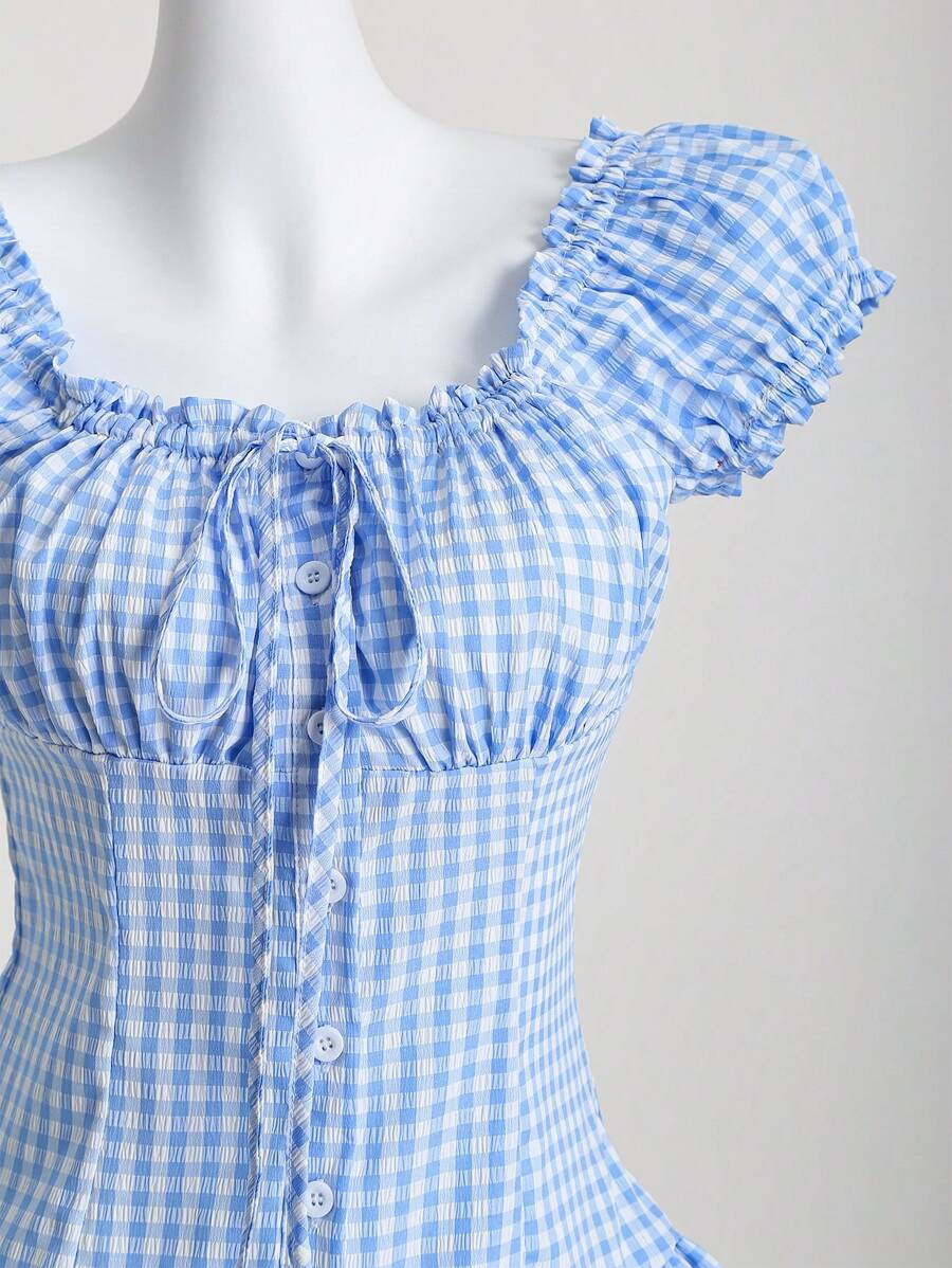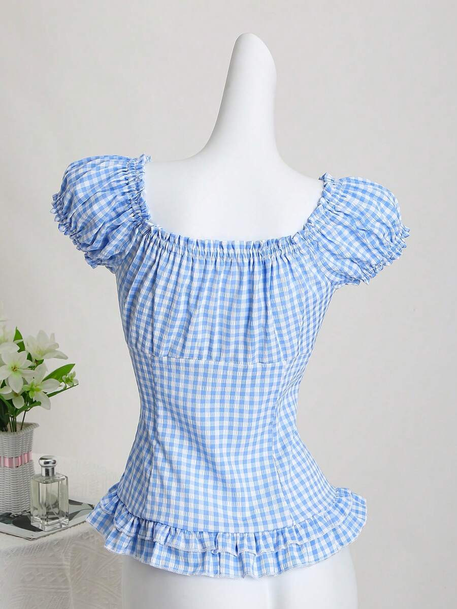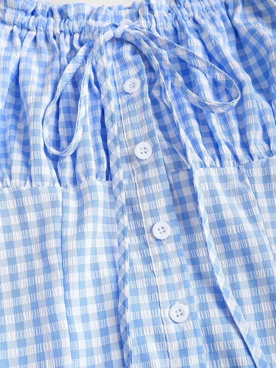 Features: Square neckline, puff sleeves, tie-front bow, slim fit, cropped length (40–50 cm), 3D pattern effect